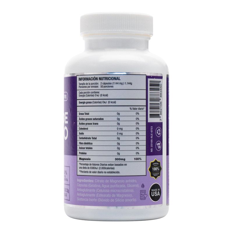 Suplemento de citrato de magnesio en cápsulas, ideal para mantener niveles adecuados de magnesio en el cuerpo. Ayuda a la función muscular, al sistema nervioso y a la salud ósea. Perfecto para quienes buscan mejorar su bienestar general y optimizar su salud física.
