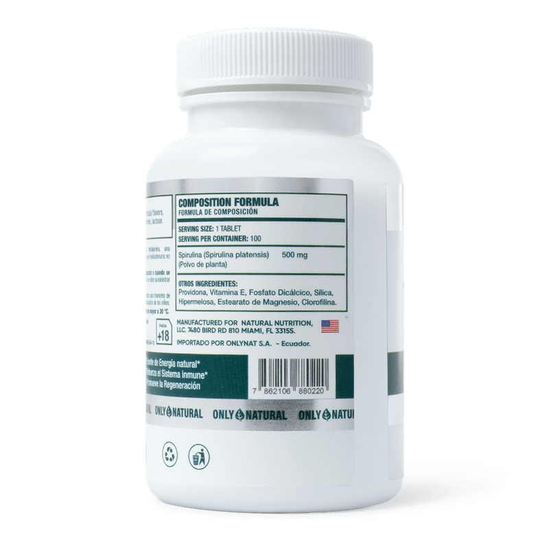 Suplemento de espirulina, un alga rica en proteínas, vitaminas y minerales que apoya el sistema inmunológico, la energía y el bienestar general. Con 500mg por tableta, ayuda a fortalecer las defensas, mejorar la digestión y proporcionar un refuerzo nutricional. Ideal para quienes buscan un suplemento natural para mantener su vitalidad y salud diaria. Perfecto para personas activas y aquellas con dietas vegetarianas.