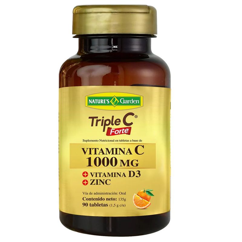 Triple C Forte 135 gr 90 tabletas Nature’s Garden es un suplemento formulado con una combinación de vitamina C y bioflavonoides cítricos que fortalecen el sistema inmunológico y actúan como potentes antioxidantes. Ayuda a proteger las células contra el daño oxidativo, favorece la producción de colágeno para mantener la salud de la piel, las encías y las articulaciones, y contribuye a una mejor absorción del hierro. Es ideal para reforzar las defensas, especialmente en temporadas de cambios climáticos o mayor exposición a enfermedades. Su presentación en tabletas permite una dosificación precisa y un consumo práctico para el cuidado diario de la salud.